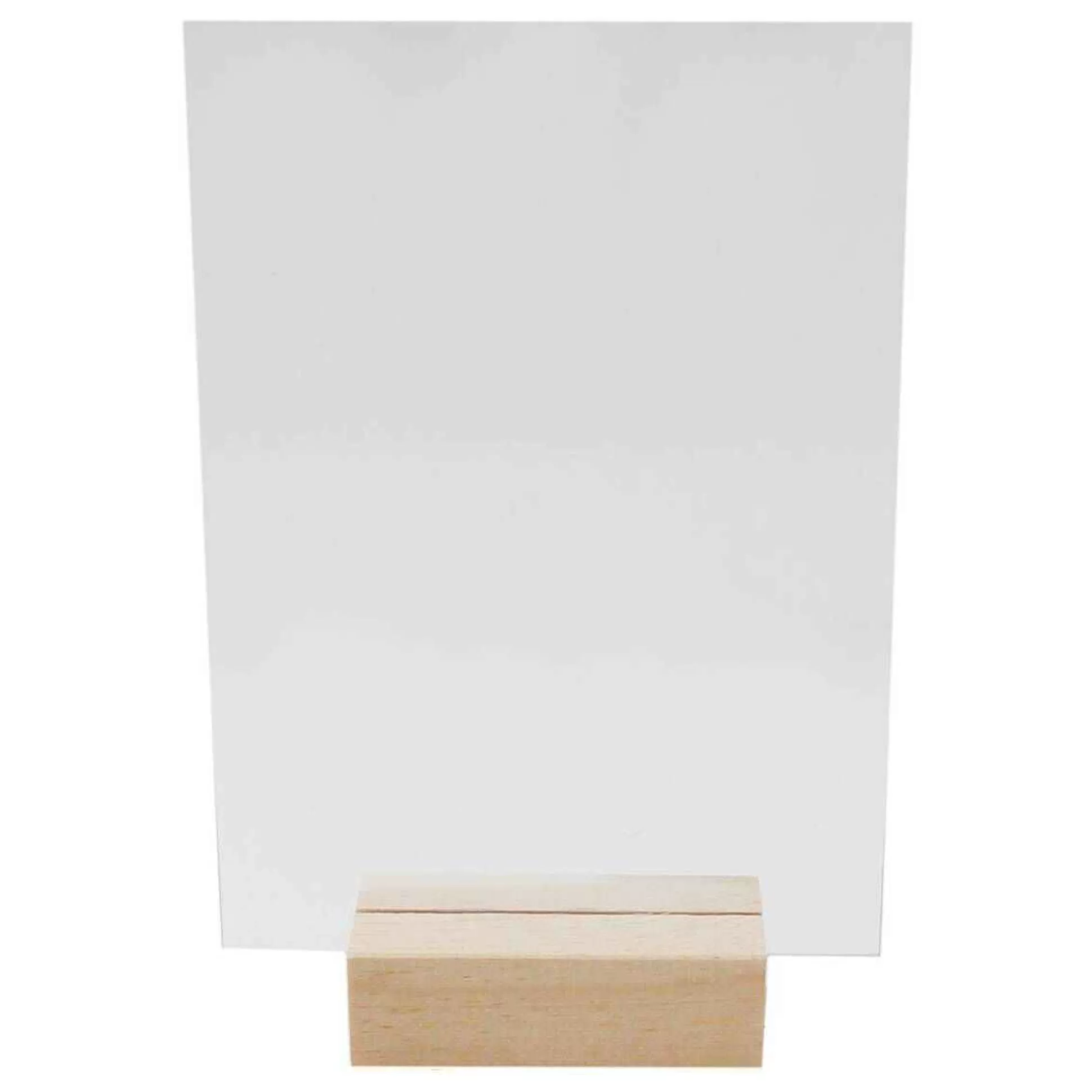 The Sign Is A Clear Acrylic Rectangle, With A Solid Wooden Block At The Base For Freestanding Display.