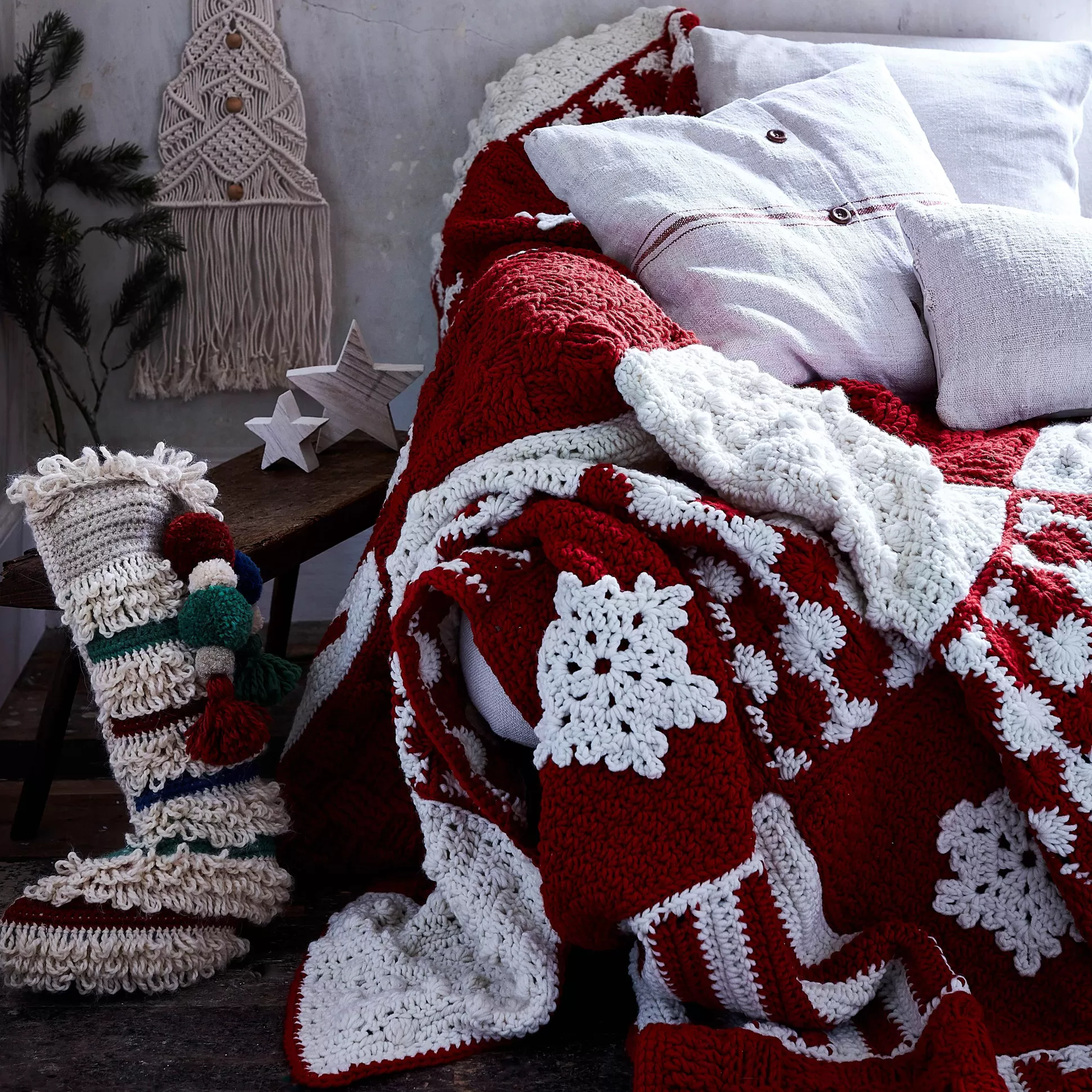 Crochet Your Way To The Fun, Festive Treat With Red And White Wi Soft And Chunky Yarn. The Textured Design Is Sure To Become A Family Favourite For The Snowy Season, With A Mixture Of Stripes, Snowflakes, Bobbles And More To Enjoy.
